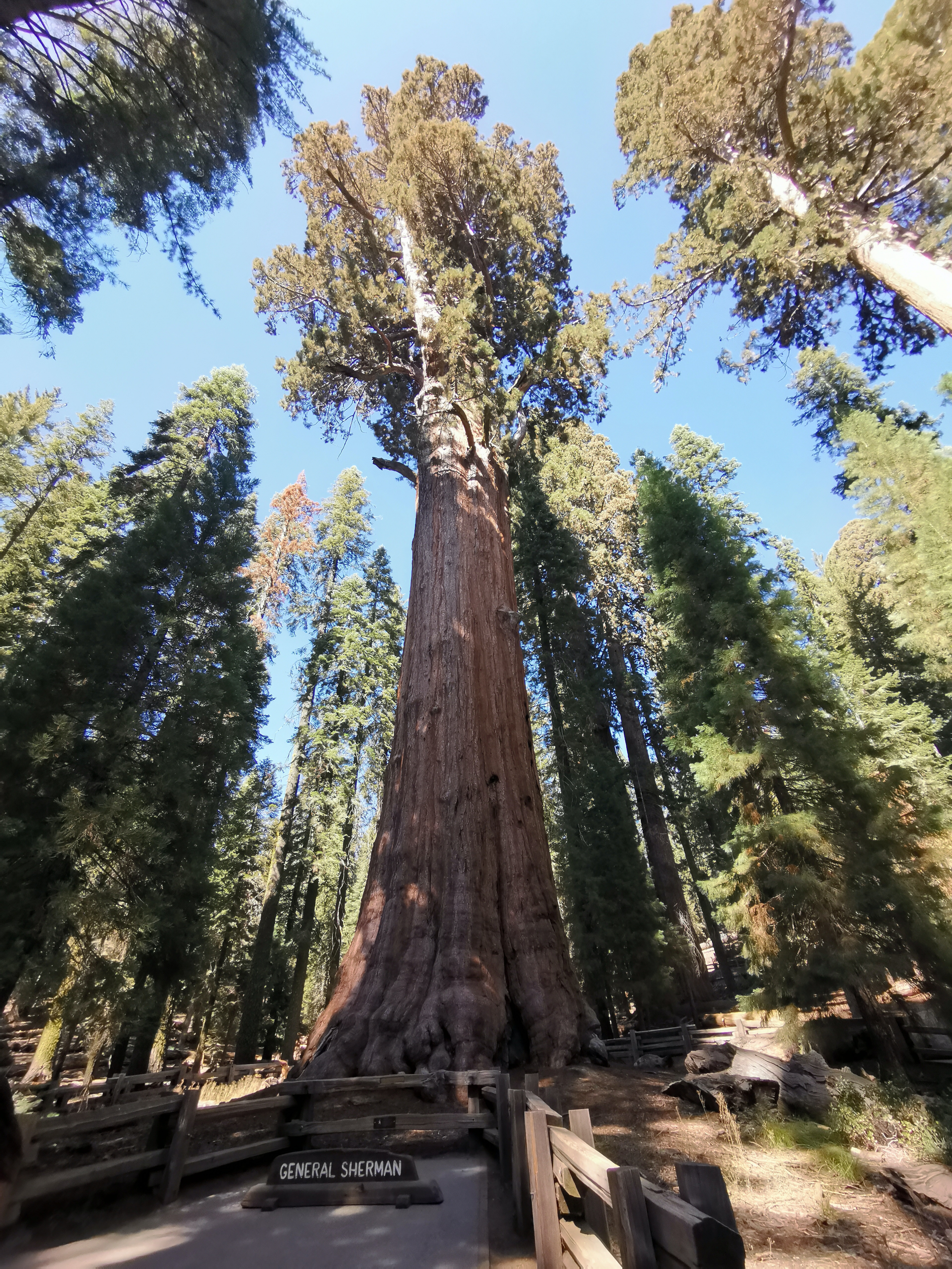 Insbesondere zog uns natürlich der angeblich größte Baum der Welt, der General Sherman, an. Bezogen auf seinen Umfang gibt es nach Aussage der Park-Ranger keinen mächtigeren Koloss auf der großen weiten Welt und mangels Überprüfungsmöglichkeit beschlossen wir, es ihm zu glauben. Obwohl wir nach dem Erlebnis im Yosemite mit ähnlichen Besuchermassen gerechnet hatten, zumal bei einem angeblich so stark besuchten Ort, war es erstaunlich leer. Selbst, als nach kurzem Spaziergang das unmissverständliche Schild den General verkündete, dauerte es kaum mehr als 30 Sekunden, bis die Chance auf ein menschenfreies Foto bestand.