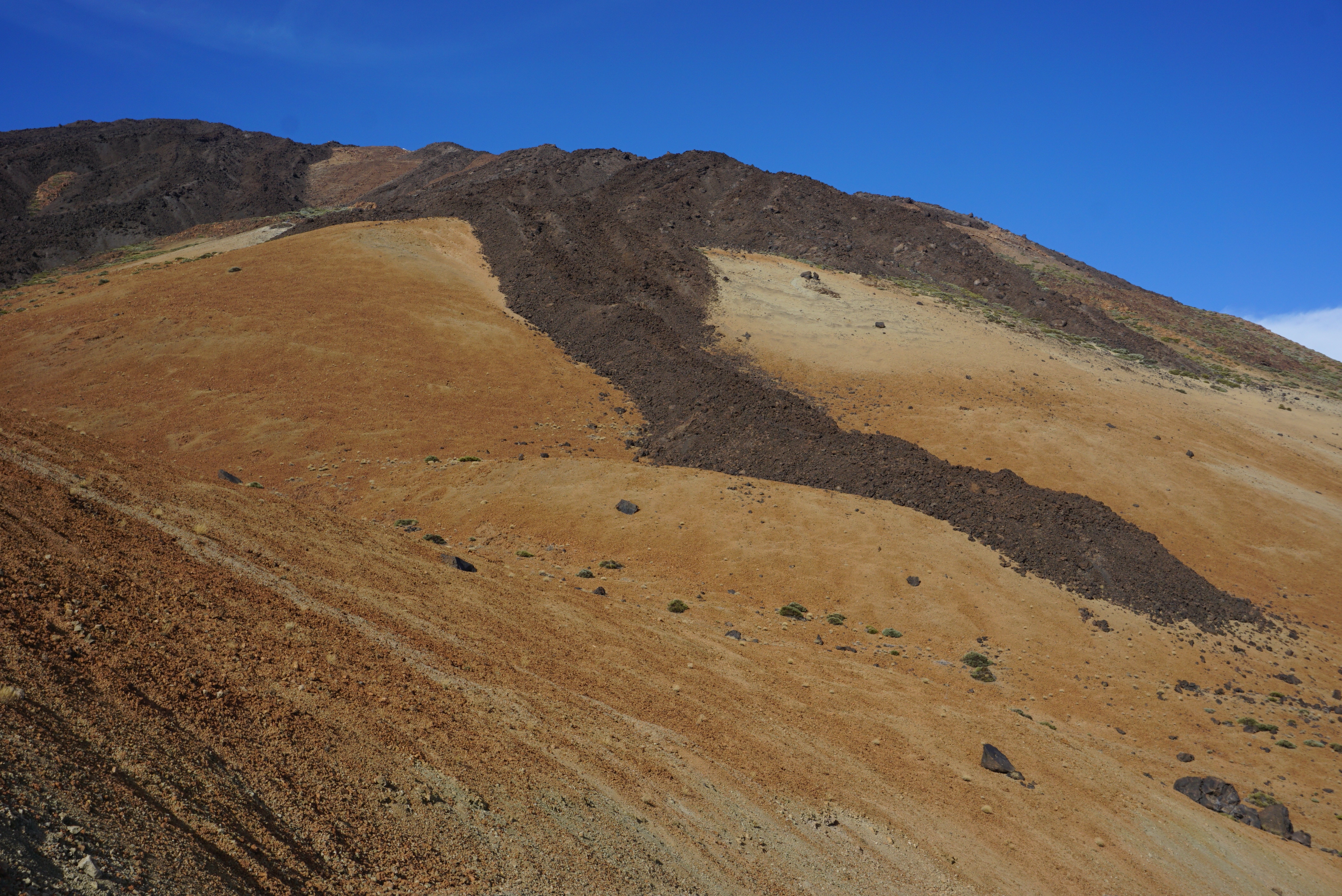 War der Einstieg an der Montaña Blanca mit dem in freundlichen Kehren aufwärts führenden Fahrweg noch völlig entspannt, hat mich der Steilanstieg in den felsigen Serpentinen wahrlich sämtlicher Kraft beraubt und zudem die Illusion gekickt, man könne alles unendlich locker wiederholen. 2007 und 2008 bin ich da schon mal hoch, jeweils in Begleitung, und es war auch in einer kritischen Rückschau nicht mal ansatzweise so anstrengend. Ich kann mich zumindest nicht daran erinnern, damals Sterne gesehen zu haben – und nein, ich war diesmal nicht nachts unterwegs.